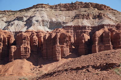 There's a carwash in the town of Escalante. We took The Rambler for a well deserved bath. She's all pretty again. We took a hike up the nature trail, the Petrified Forest trail. A 1 mile loop that is moderate to strenuous. Ron continued on the Trail of Sleeping Rainbows. We saw a balanced rock, roundleaf buffalo berry, lichen, a painted desert, and the most beautiful petrified wood. The state park is 1400 acres. There's about 5 1/2 million tons of exposed fossilized wood here.